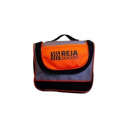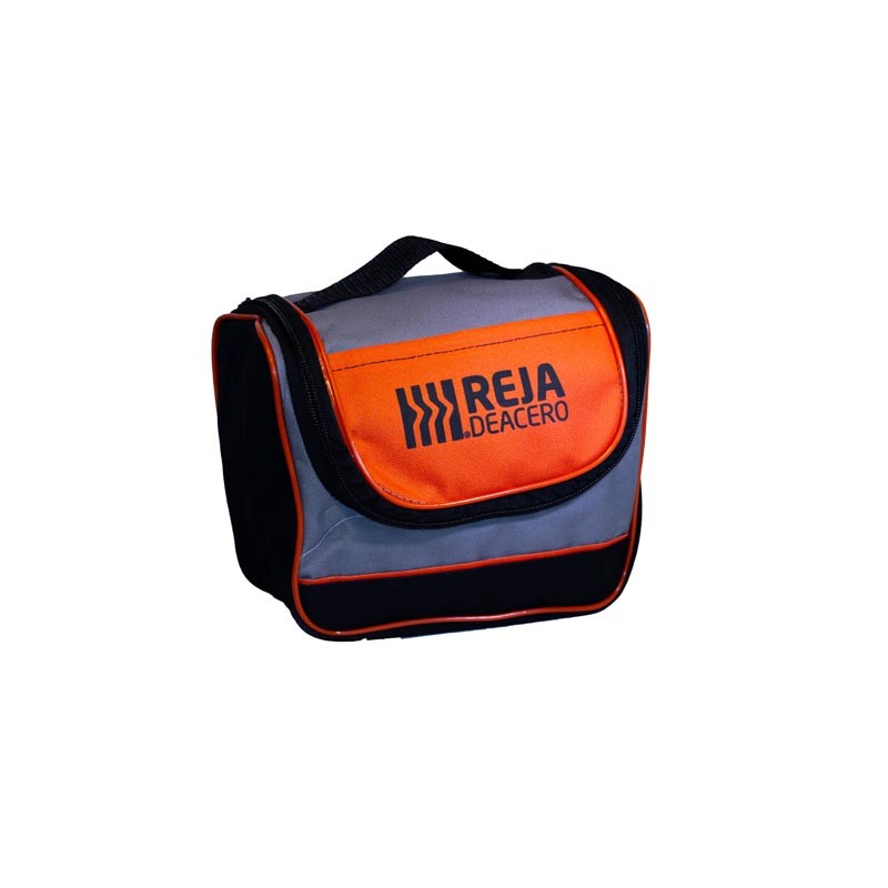 Lonchera bicolor Negro/naranja/gris nylon cosida y con logo impreso REJA DEACERO a un tono